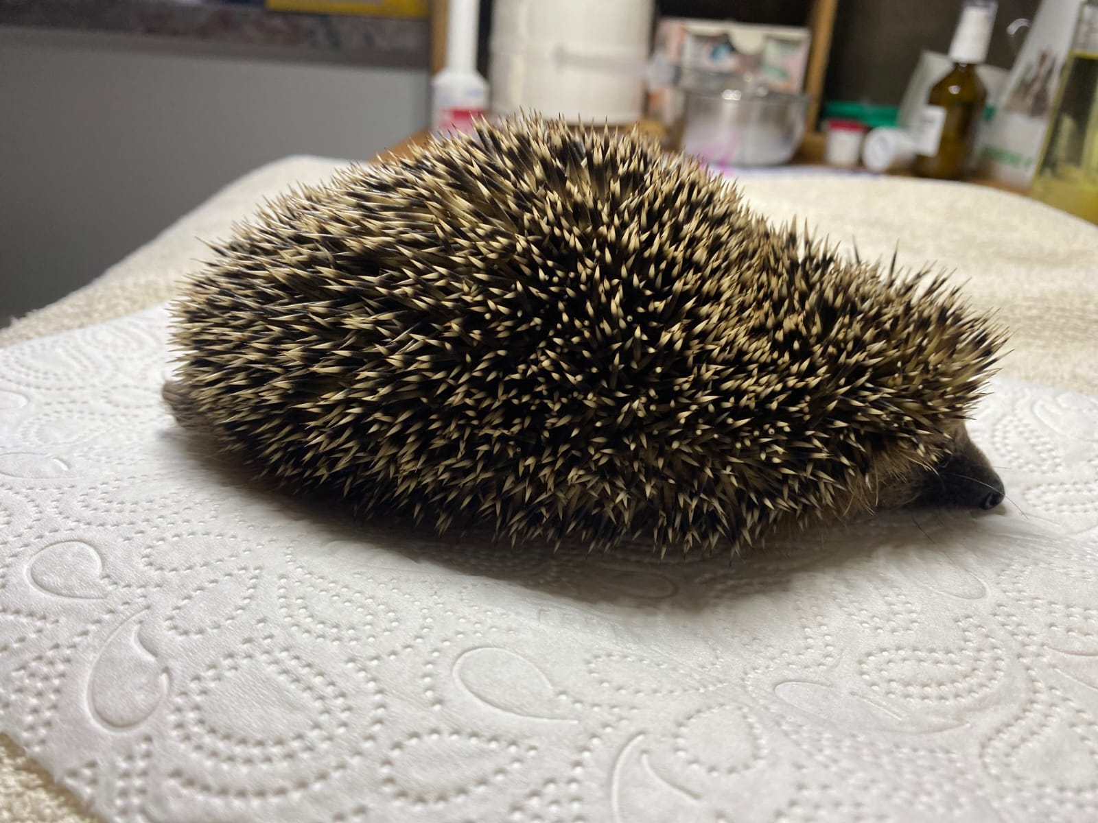 Igel sind schneller, als man vermutet und haben sie sich wieder versteckt, findet man sie meist nicht mehr. Deshalb als erstes einfangen (gut geht es mit einem Handtuch und die stachelsicheren Handschuhe nicht vergessen). Waage parat halten und ihn wiegen, denn das muss man meist wissen. Wiegt er ab Anfang November unter 600 g, dann ihn mit rein ins Warme (18-20° Grad) nehmen. Ein Pappkarton (mind. 35 cm hoch, denn sie sind Ausbruchskünstler) und ein Kuschelhandtuch in den Karton hineingeben.
